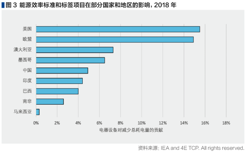 在有數(shù)據(jù)可查的九個國家和地區(qū)中,效率標準和標簽減少的電力需求量,相當于風能和太陽能的總發(fā)電量。這些標準在歐盟和美國實施的時間更長,但中國正在迎頭趕上。在中國,標準的實施已經(jīng)幫助每年避免了全國總電力消耗的5%左右,每年減少 8000萬噸的二氧化碳排放。隨著舊設備被更高效的設備所取代,這些節(jié)約將越來越多,盡管標準需要不斷提高以優(yōu)化節(jié)能。