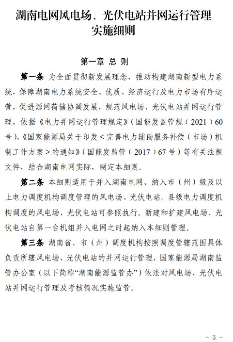 為全面貫徹新發(fā)展理念,推動構(gòu)建湖南新型電力系統(tǒng),保障湖南電力系統(tǒng)安全、優(yōu)質(zhì)、經(jīng)濟(jì)運(yùn)行,促進(jìn)網(wǎng)源荷儲協(xié)調(diào)發(fā)展,規(guī)范風(fēng)電場、光伏電站并網(wǎng)運(yùn)行管理,依據(jù)《電力并網(wǎng)運(yùn)行管理規(guī)定》(國能發(fā)監(jiān)管規(guī)﹝2021﹞60號)等有關(guān)法律法規(guī)和技術(shù)標(biāo)準(zhǔn),我辦組織制定了《湖南電網(wǎng)風(fēng)電場、光伏電站并網(wǎng)運(yùn)行管理實(shí)施細(xì)則》,現(xiàn)印發(fā)你們,請遵照執(zhí)行。
