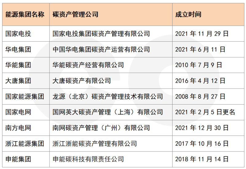 目前,國(guó)內(nèi)發(fā)電集團(tuán)等重點(diǎn)控排主體或通過(guò)成立專(zhuān)業(yè)的碳資產(chǎn)管理公司,或組建專(zhuān)門(mén)的碳資產(chǎn)管理部門(mén)來(lái)實(shí)現(xiàn)碳市場(chǎng)的履約和資產(chǎn)管理。公開(kāi)信息可見(jiàn),五大發(fā)電集團(tuán)、部分地方發(fā)電集團(tuán)及電網(wǎng)均成立了專(zhuān)業(yè)的碳資產(chǎn)管理公司。