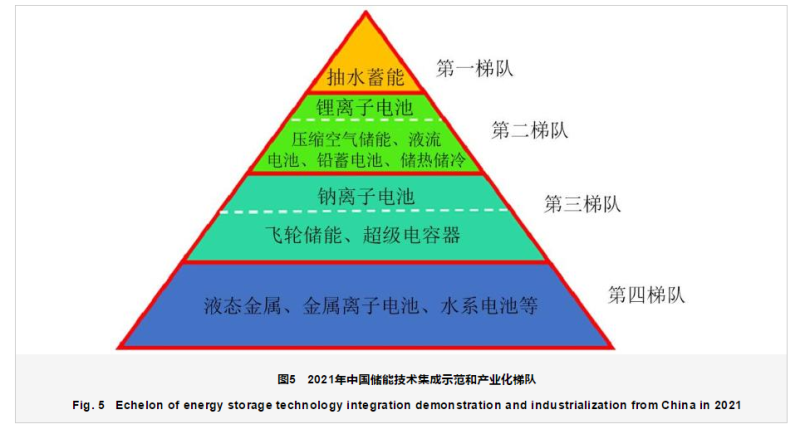 如圖5所示,綜合分析各儲(chǔ)能技術(shù)2021年的新增裝機(jī)容量,各種儲(chǔ)能技術(shù)大致可以分為四個(gè)梯隊(duì)。第一梯隊(duì)為抽水蓄能,單機(jī)規(guī)模100 MW以上,占2021年全國(guó)儲(chǔ)能新增裝機(jī)的79%左右;第二梯隊(duì)為鋰離子電池、壓縮空氣儲(chǔ)能、液流電池、鉛蓄電池和儲(chǔ)熱儲(chǔ)冷技術(shù),單機(jī)規(guī)??蛇_(dá)10~100 MW,其中鋰離子電池新增裝機(jī)達(dá)到18%,未來(lái)有可能形成單獨(dú)的一個(gè)梯隊(duì);第三梯隊(duì)為鈉離子電池、飛輪儲(chǔ)能和超級(jí)電容器,目前單機(jī)規(guī)??梢赃_(dá)到MW級(jí),其中鈉離子發(fā)展受關(guān)注最多,經(jīng)過(guò)一段時(shí)間的發(fā)展有可能未來(lái)進(jìn)入第二梯隊(duì);第四梯隊(duì)為液態(tài)金屬、金屬離子電池和水系電池等新型儲(chǔ)能技術(shù),需要進(jìn)一步的研發(fā),以盡早實(shí)現(xiàn)集成示范和產(chǎn)業(yè)化應(yīng)用。