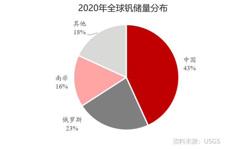 全球釩礦儲量主要集中在中國、俄羅斯、南非,中國儲量占全球的43%。根據(jù)USGS數(shù)據(jù),全球釩礦儲量共計(jì)2200萬噸(金屬量,下同),其中中國儲量950 萬噸,占比達(dá)到43%,俄羅斯和南非占比分別達(dá)到23%和16%。