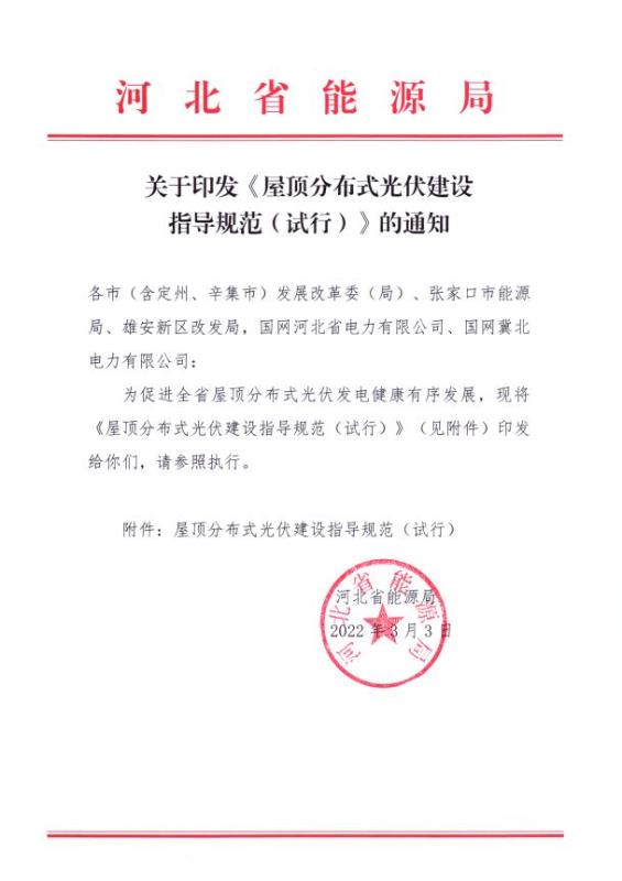 中國儲能網(wǎng)訊:3月16日,河北省能源局發(fā)布《屋頂分布式光伏建設(shè)指導(dǎo)規(guī)范(試行)》的通知。根據(jù)文件,本規(guī)范規(guī)定了屋頂分布式光伏項目工作流程、規(guī)劃要求、項目立項、本體設(shè)計、接網(wǎng)設(shè)計、工程建設(shè)、并網(wǎng)調(diào)試、工程驗收、調(diào)控與保護、運行維護、交易結(jié)算、用電監(jiān)察、項目評價等應(yīng)遵循的基本要求。
