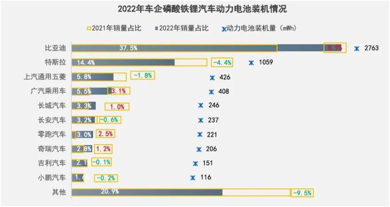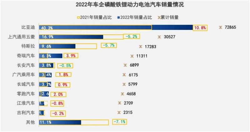 比亞迪旗下大部分車型均搭載自家磷酸鐵鋰刀片電池,1月所售磷酸鐵鋰車型中,超過40%的車型產自比亞迪。上汽通用五菱、特斯拉、奇瑞、長安、廣汽乘用車、長城汽車、零跑汽車、吉利汽車、小鵬汽車,江淮汽車,旗下入門級新能源車型在磷酸鐵鋰動力電池的裝載上,均有傾向。