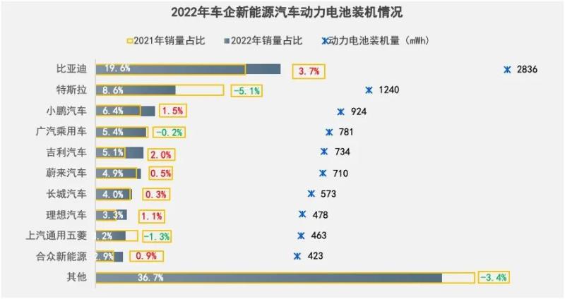特斯拉、小鵬、廣汽乘用車、吉利、蔚來和哪吒車型動力電池裝機情況比銷量顯強勢,是因為這些車企多走的是純電路線,熱銷車型多是緊湊型及以上,帶電量明顯更高。