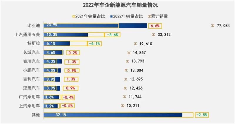 1月TOP10車企新能源汽車銷售218,746輛,占比67.9%,與2021年相比,市場份額提升2.5%。
