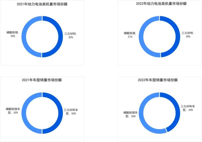 動力電池主要分為三元動力電池和磷酸鐵鋰動力電池,近幾年磷酸鐵鋰電池裝機量占比一路走高,相應地三元動力電池占比持續(xù)走低。2022年是A級車市場走強的機會,也是磷酸鐵鋰電池繼續(xù)提高占比的推力。