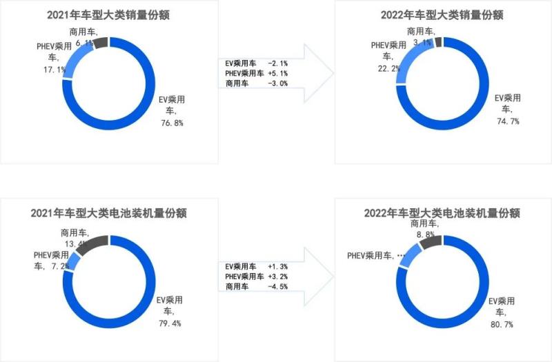 不管從什么層級看,2021年單車帶電量均呈現上升趨勢,最主要的原因在于動力電池性能提升。也是在2021年,純電乘用車平均單車帶電量反超新能源乘用車平均單車帶電量,究其原因還是因為新能源商用車銷量份額的進一步。