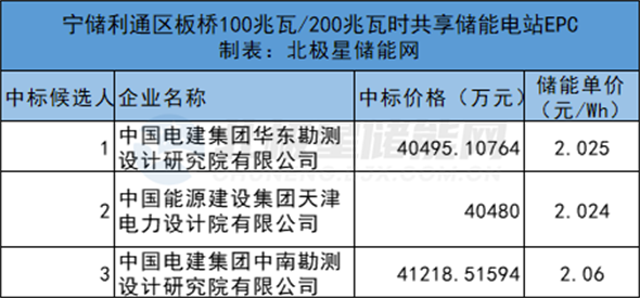 中國儲能網訊:3月12日,寧夏儲能技術服務有限公司發(fā)布寧儲利通區(qū)板橋100 兆瓦/200 兆瓦時共享儲能電站 EPC中標候選人公示。中國電建集團華東勘測設計研究院有限公司為第一候選人,中標價格40495.10764萬元,中標單價2.025元/Wh。中國能源建設集團天津電力設計院有限公司為第二候選人,中標價格40480萬元,中標單價2.024元/Wh。第三候選人為中國電建集團中南勘測設計研究院有限公司,中標價格41218.515935萬元,中標單價2.06元/Wh。