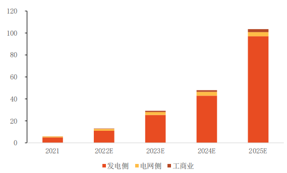 新增裝機(jī)量中,以政策推動(dòng)的發(fā)電側(cè)占比最大。2022-2025年分別占總量的87.6%、89.0%、89.6%、93.7%。其次為發(fā)電側(cè)。