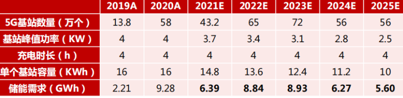 2023年每萬(wàn)人享18個(gè)5G基站,2025年每萬(wàn)人享26個(gè)(工信部預(yù)期數(shù)據(jù))。民生證券預(yù)計(jì)2022-2025年的裝機(jī)量分別為8.84,8.93,6.27,5.60GWh。新增裝機(jī)量的21-25年年復(fù)合增長(zhǎng)率約104.5%。