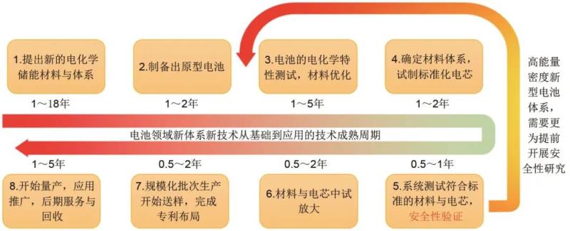 綜上所述,為了在發(fā)展高能量密度電池的同時保證電池的安全性,研究者們需要在優(yōu)化電芯電化學(xué)性能的同時,盡快同步地開展前瞻性電池安全性驗(yàn)證和研究。只有清晰全面地認(rèn)識電池?zé)崾C(jī)制和各個維度安全性的影響因素,才能在應(yīng)用階段做好電池的有效安全預(yù)防。圖8給出了電池領(lǐng)域新材料和新技術(shù)從基礎(chǔ)研究到規(guī)模量產(chǎn)的技術(shù)成熟周期。可以看出,一個新型技術(shù)的大規(guī)模應(yīng)用需要投入巨額的人力物力,花費(fèi)數(shù)十年的時間,才能真正實(shí)現(xiàn)量產(chǎn)。然而,電池的安全性驗(yàn)證卻往往在電池接近量產(chǎn)的階段才展開,且往往以通過電池安全測試標(biāo)準(zhǔn)為目的,無法系統(tǒng)深入地了解電池在全生命周期、實(shí)際復(fù)雜工況下的安全行為和內(nèi)在機(jī)理,為日后的安全事故埋下隱患。對于早期的電池體系,由于能量密度不高,安全性問題并不突出,而最新的鋰離子電池電芯能量密度已經(jīng)可以達(dá)到300 W·h/kg以上,產(chǎn)學(xué)界廣泛關(guān)注的鋰電池新技術(shù)和新體系能量密度更高。這些具有高能量密度特性的新技術(shù)和新體系面臨著更為嚴(yán)峻的安全性挑戰(zhàn),因此,將電池的安全性研究和驗(yàn)證步驟盡可能提前,在基本確定電芯結(jié)構(gòu)后盡可能早地開展電池安全測試與機(jī)理研究工作,才有望在真實(shí)量產(chǎn)階段前期就做好準(zhǔn)備,摸清其安全性特征與行為,設(shè)計(jì)好對應(yīng)的防護(hù)、預(yù)警措施。