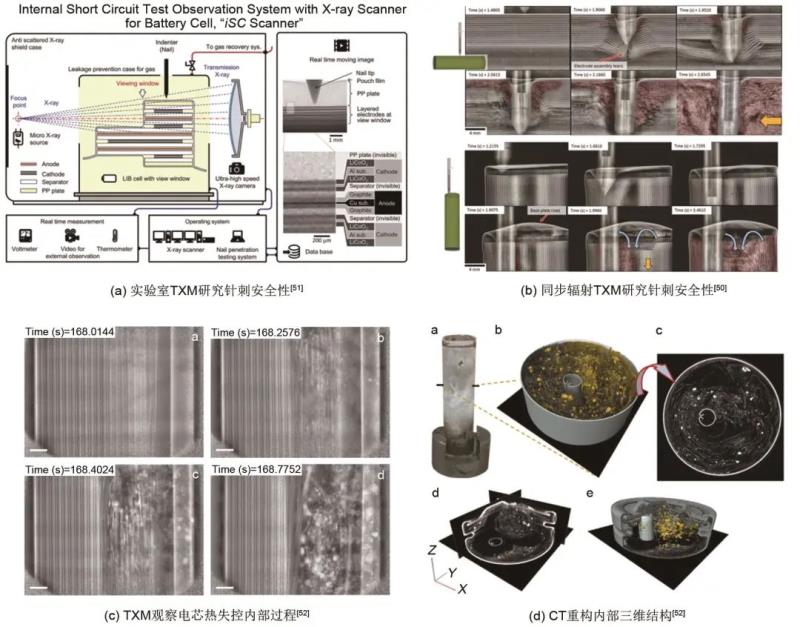 為了更直觀地理解熱失控過程中電池內(nèi)部物質(zhì)、結(jié)構(gòu)的演化,研究人員發(fā)展了結(jié)合紅外測溫以及原位針刺等輔助功能的透射X射線顯微方法如圖7(a)~(c)所示。由于熱失控往往是在極短的時間內(nèi)發(fā)生劇烈的反應(yīng),同時伴隨劇烈的物相、結(jié)構(gòu)變化。這一特點(diǎn)給TXM表征方法提出了相當(dāng)高的時間分辨率的要求。實(shí)驗(yàn)室X光源能夠發(fā)射出的X射線光電子數(shù)量有限,采集一組TXM影像數(shù)據(jù)需要較長的時間。為了觀察劇烈變化的熱失控過程,F(xiàn)inegan等在歐洲同步輻射實(shí)驗(yàn)室(ESRF)使用同步輻射光源將TXM的曝光時間降低至44 μs,配合針內(nèi)預(yù)埋的熱電偶溫度傳感器,實(shí)現(xiàn)了對針刺發(fā)生時電池內(nèi)部形貌與刺入點(diǎn)溫度的同步監(jiān)控。該團(tuán)隊(duì)利用這種手段研究了刺針縱向與徑向刺入18650商業(yè)圓柱電池時電池內(nèi)部熱失控行為的差異。Yokoshima等采用實(shí)驗(yàn)室光源進(jìn)行連續(xù)實(shí)時的透射X射線照相技術(shù),也得到了軟包電池在針刺過程中結(jié)構(gòu)隨時間變化的一組透射投影圖。該方法以4 ms的時間分辨率較為清晰地觀察到了針刺入軟包電池后電池內(nèi)部每一層材料的形變過程,以及針刺深度與熱失控程度的對應(yīng)關(guān)系。