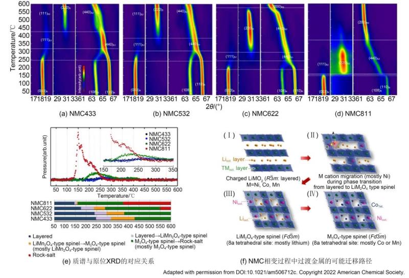電池材料在升溫過程中發(fā)生相變和化學(xué)反應(yīng),其形貌、結(jié)構(gòu)、成分和元素價態(tài)都有可能發(fā)生變化,這些變化需要基于對應(yīng)的方法進(jìn)行表征分析,如利用掃描電子顯微鏡觀察材料熱分解前后的形貌變化,利用X射線衍射和光譜學(xué)研究材料結(jié)構(gòu)和元素價態(tài)演變。由于材料熱分解和熱反應(yīng)存在顯著的動力學(xué)效應(yīng),在加熱過程中原位測試可以最大程度地還原物相變化的真實(shí)過程。目前較為成熟的原位表征技術(shù)主要有兩類:一類是與熱分析儀器串聯(lián)使用的質(zhì)譜、紅外光譜等,可以實(shí)時監(jiān)測物質(zhì)分解產(chǎn)生的氣體類型,判斷材料加熱過程中化學(xué)組成的變化;另一類是原位X射線衍射技術(shù),通過特制的樣品臺,可以在升溫過程中實(shí)時、原位測定材料的結(jié)構(gòu)變化,目前全球多數(shù)同步輻射光源和一些實(shí)驗(yàn)室級的X射線衍射儀上都可以實(shí)現(xiàn)原位變溫XRD測試。Nam等利用變溫XRD發(fā)現(xiàn)脫鋰態(tài)LiNi1/3Co1/3Mn1/3O2結(jié)構(gòu)在350 ℃向尖晶石轉(zhuǎn)變,而加入電解液后該轉(zhuǎn)變溫度會下降至304 ℃。Yoon等在LiNi0.8Co0.2O2中發(fā)現(xiàn)了類似的規(guī)律,并發(fā)現(xiàn)MgO包覆可以改善脫鋰態(tài)正極在電解液中的相變。圖5展示了變溫XRD和MS的聯(lián)用技術(shù),系統(tǒng)研究了不同Ni含量的脫鋰態(tài)NCM三元正極在升溫過程中的結(jié)構(gòu)和成分變化,研究發(fā)現(xiàn)三元正極失穩(wěn)釋放氧氣的過程與結(jié)構(gòu)在高溫下轉(zhuǎn)化為尖晶石相的行為直接對應(yīng),且這一過程的起始溫度隨鎳含量的上升顯著下降,NCM523的起始相變溫度約為240 ℃,NCM811則小于150 ℃,從體相結(jié)構(gòu)的本征變化解釋了高鎳正極在電池應(yīng)用中熱安全性差的原因。以上工作都是基于同步輻射光源實(shí)現(xiàn)的,由于同步輻射提供的光源質(zhì)量高、掃譜速度快,更適用于研究與時間相關(guān)的動力學(xué)問題。除此之外,近年來基于X射線譜學(xué)以及拉曼光譜實(shí)現(xiàn)同步表征的方法均有所發(fā)展。結(jié)合通過熱分析手段觀察得到的材料熱行為信息,并對升溫過程中材料物相變化的研究,可以更深刻地理解材料演變以及電池體系熱失穩(wěn)的動力學(xué)過程,為材料的安全性改良提供理論指導(dǎo)。