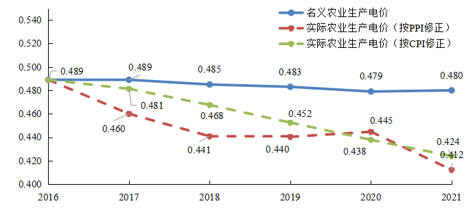 圖5 農(nóng)業(yè)生產(chǎn)電價名義與實際變化趨勢圖