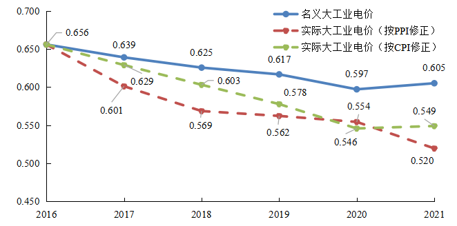 圖4 大工業(yè)電價名義與實際變化趨勢圖