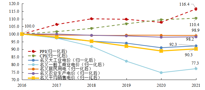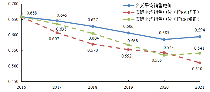 考慮通貨膨脹因素,按照物價指數(shù)對名義銷售電價進行還原,可得到實際銷售電價變動情況。2021年與2016年相比:
