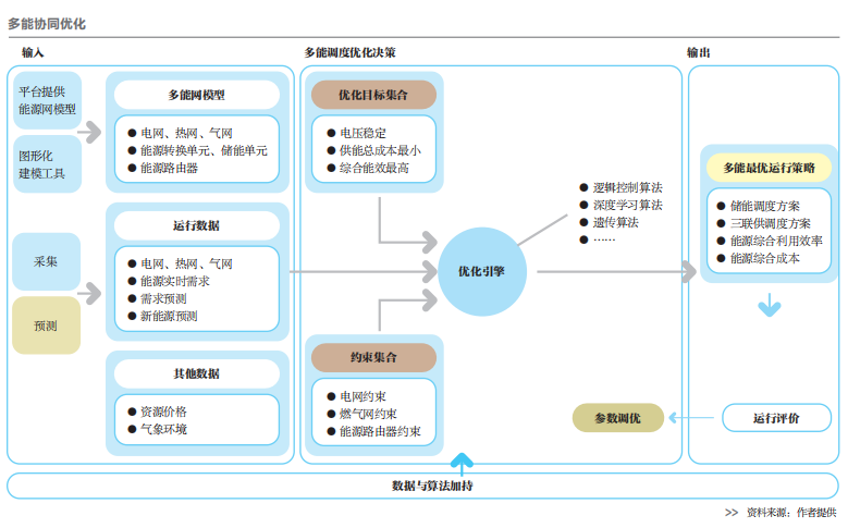 以新型電力系統(tǒng)的一個重要組成部分——末端的區(qū)域綜合能源智能化為例,區(qū)域綜合能源系統(tǒng)是一個復(fù)雜的系統(tǒng),供能側(cè)既有大電網(wǎng)供電,又有多種分布式能源、儲能,電、熱、冷、燃氣、壓縮空氣儲能等多種能源工質(zhì)混雜;用能側(cè)既要求安全、穩(wěn)定、持續(xù)供能,又要求能夠智慧用能,經(jīng)濟高效地對企業(yè)生產(chǎn)波動、能源市場波動、能源系統(tǒng)波動進行快速響應(yīng),實現(xiàn)能源利用效率最大化。在這種情況下,區(qū)域綜合能源平衡相對于傳統(tǒng)的配電網(wǎng)電力電量平衡,復(fù)雜程度要上升好幾個數(shù)量級。單純依靠傳統(tǒng)的能源技術(shù)、電力電子與自控技術(shù),已經(jīng)很難實現(xiàn)整體上的平衡和優(yōu)化,必須依靠數(shù)字化技術(shù),利用數(shù)字技術(shù)與能源技術(shù)包括自控技術(shù)的深度融合,實現(xiàn)區(qū)域能源系統(tǒng)的“安穩(wěn)長滿優(yōu)”運行。