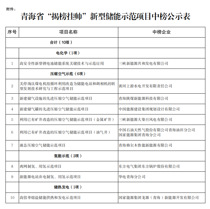 附件:青海省“揭榜掛帥”新型儲(chǔ)能示范項(xiàng)目中榜公示表