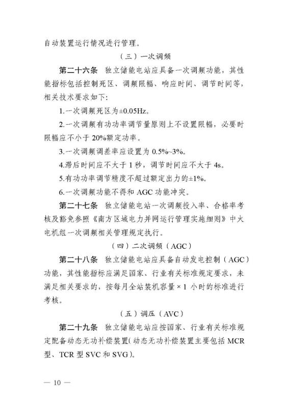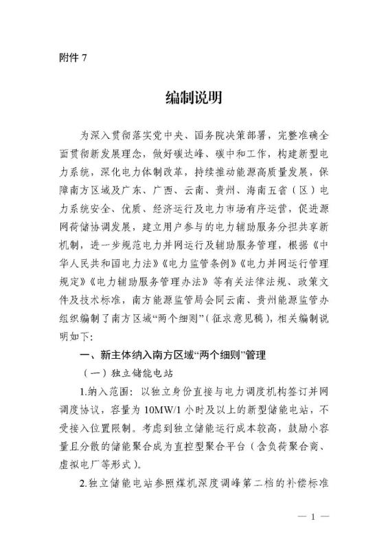 其中附件《南方區(qū)域新型儲能并網(wǎng)運行及輔助服務(wù)管理實施細則(征求意見稿)》明確:適用于南方區(qū)域地市級及以上電力調(diào)度機構(gòu)直接調(diào)度的容量為10兆瓦/1小時及以上的獨立電化學(xué)儲能電站。其他飛輪、壓縮空氣等新型儲能電站參照執(zhí)行。