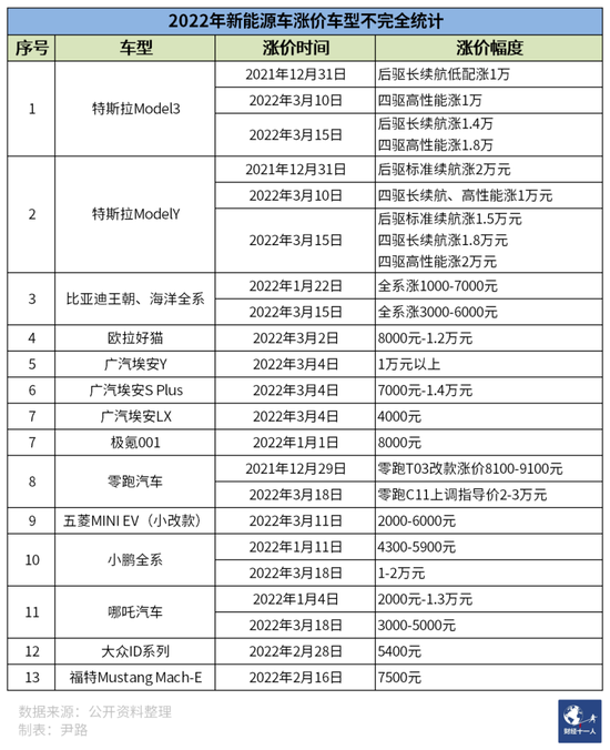 表1:2022年新能源車漲價(jià)車型不完全統(tǒng)計(jì)