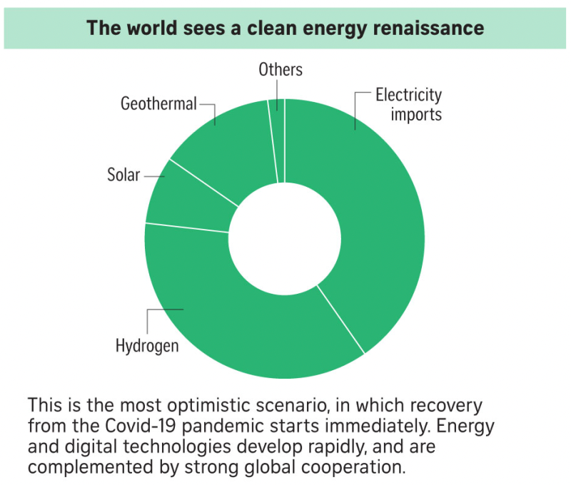 在最樂觀的情況下,能源和數(shù)字技術(shù)發(fā)展迅速,并輔之以強(qiáng)有力的全球合作。這使新加坡能夠在2050年實現(xiàn)多樣化的能源供應(yīng)組合,有能力從多個國家進(jìn)口能源,并將低碳?xì)溆米麝P(guān)鍵能源。第二種情況假設(shè)COVID-19復(fù)蘇的路徑更長,推遲投資到清潔能源技術(shù),導(dǎo)致新的發(fā)展停滯。在這種情況下,天然氣仍然是新加坡能源結(jié)構(gòu)的重要組成部分,排放量通過從其他地方購買碳信用額度來抵消。