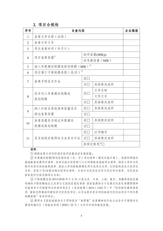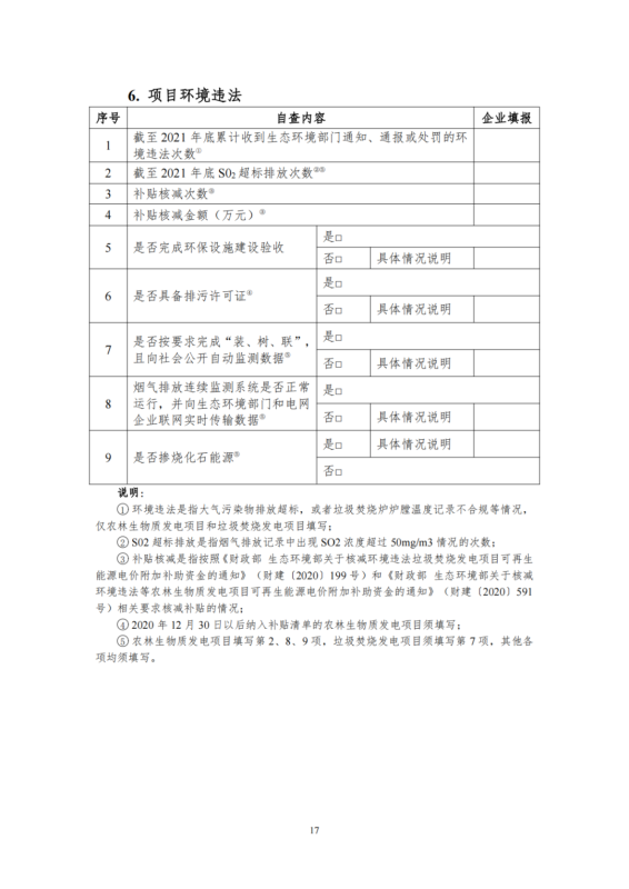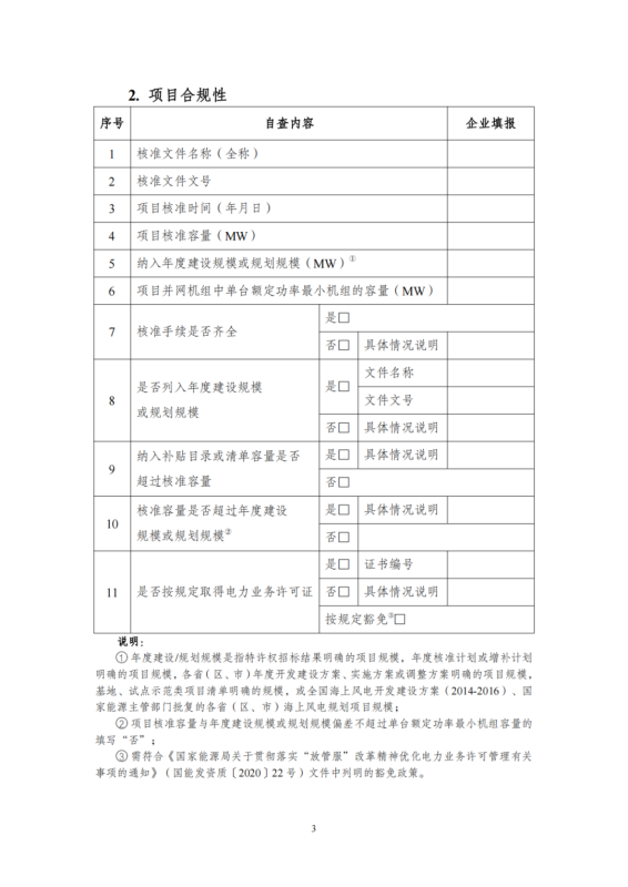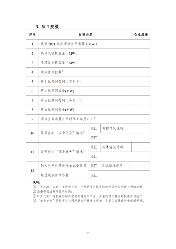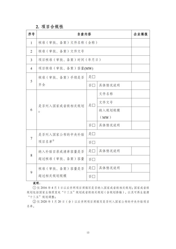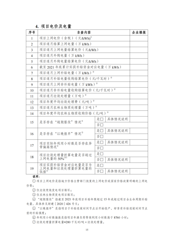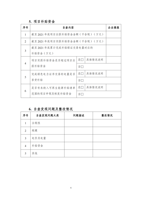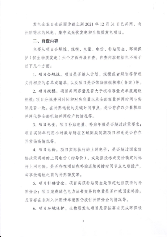 自查內(nèi)容主要從項目的合規(guī)性、規(guī)模、電量、電價、補貼資金、環(huán)境保護(僅限于生物質(zhì)發(fā)電)六個方面進行。