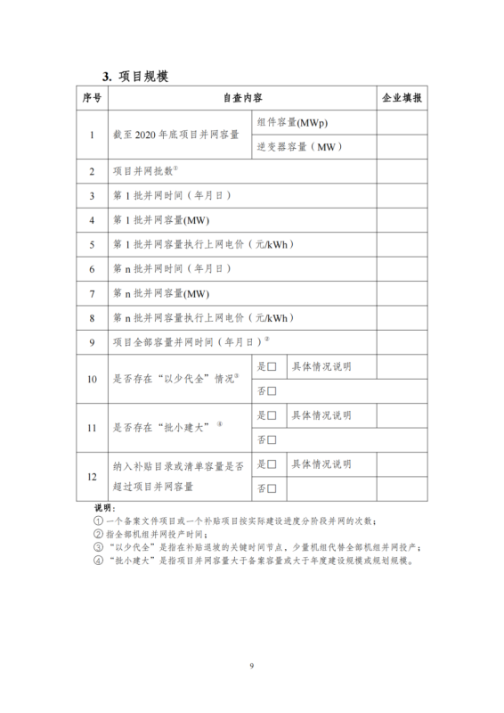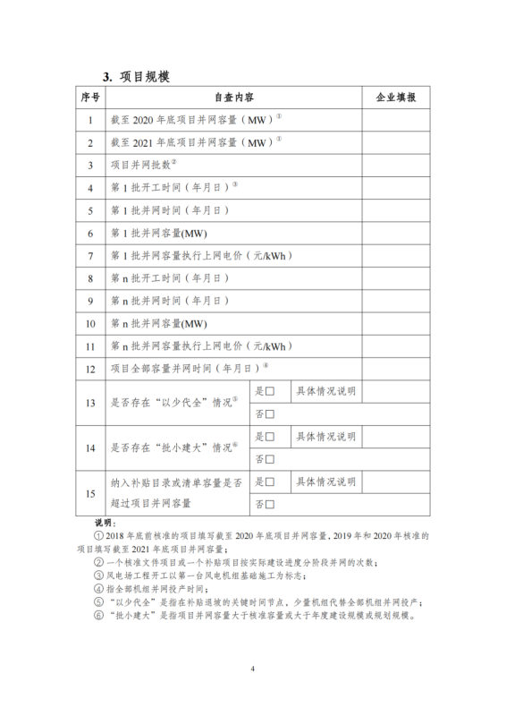 在規(guī)模自查方面,要注意項目并網(wǎng)容量是否大于核準容量或年度建設規(guī)模,項目分批并網(wǎng)時間和對應容量以及全部容量并網(wǎng)時間與實際是否一致。在補貼退坡的關(guān)鍵節(jié)點是否存在以少量機組并網(wǎng)代替全部機組并網(wǎng)投產(chǎn)的情況。