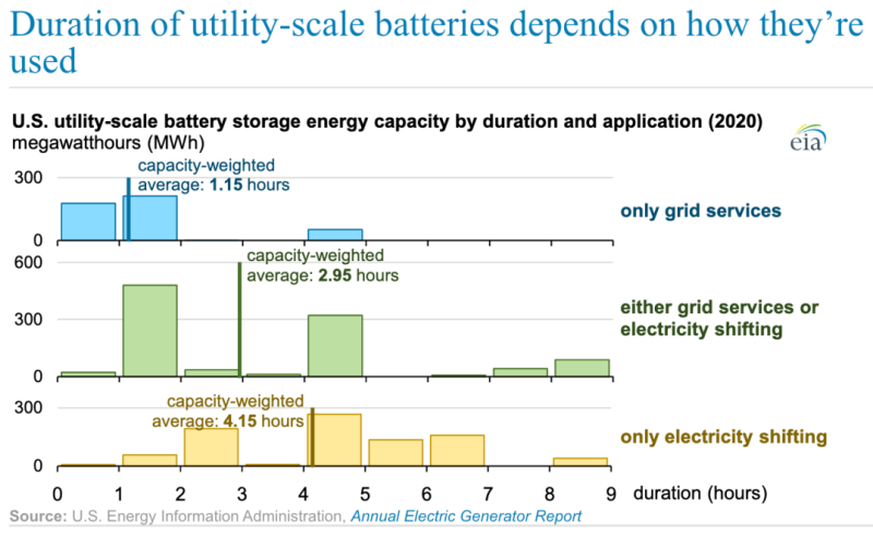 用于電網(wǎng)服務(wù)的電池平均持續(xù)時(shí)間相對較短(電池的平均持續(xù)時(shí)間是指電池在其銘牌功率容量下提供電能直至耗盡的時(shí)間);用于電力負(fù)荷轉(zhuǎn)移的電池持續(xù)時(shí)間相對較長。持續(xù)時(shí)間少于兩小時(shí)的電池被視為短時(shí)間電池,幾乎所有電池都可以提供有助于維持電網(wǎng)穩(wěn)定的電網(wǎng)服務(wù)。提供電網(wǎng)服務(wù)的電池會在短時(shí)間內(nèi)放電,有時(shí)甚至只有幾秒鐘或幾分鐘。部署短時(shí)儲能電池具有經(jīng)濟(jì)性,2010年代末安裝的大多數(shù)電池容量由用于電網(wǎng)服務(wù)的短時(shí)儲能電池組成。但隨著時(shí)間的推移,這種趨勢正在改變。