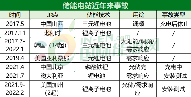 2017-2022全球儲(chǔ)能電站火災(zāi)情況(部分)