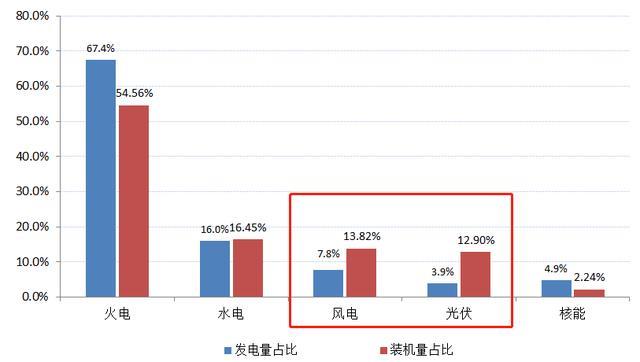 究其原因,光伏和風(fēng)電這類可再生能源是典型的間歇性能源。什么意思?以風(fēng)電作為例子,一般在凌晨是風(fēng)力發(fā)電的高峰,但卻是用戶用電的低峰,發(fā)那么多電,用不完;等到早上用電高峰來了,結(jié)果風(fēng)停了,用戶又用不上風(fēng)電。這也是為什么風(fēng)電、光伏的發(fā)電量與裝機量占比存在較大差異。
