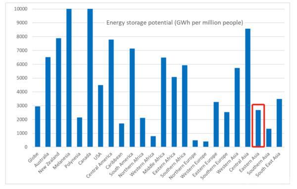 圖6:東亞地區(qū)擁有每百萬人2400GWh的潛在儲能容量,資料來源:澳大利亞國立大學(xué)研究團隊
