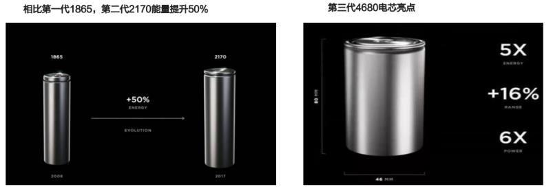2020年9月22日,特斯拉CEO馬斯克在特斯拉電池日上發(fā)布了第三代4680電芯。相比于第二代2170電芯,4680電芯的能量提升了5倍,輸出功率提升6倍,配合著新的裝配工藝,可以讓電動車?yán)m(xù)航提升54%,每千瓦時電池價格下降56%,生產(chǎn)成本降低69%。