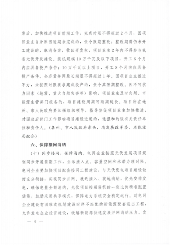 (九)推動項目加快建設(shè),限期投產(chǎn)。各州、市人民政府應(yīng)督促項目業(yè)主在取得開發(fā)權(quán)后,1個月內(nèi)完成項目備案。完成備案后,加快推進項目前期工作,完成時限不得超過2個月,因項目業(yè)主自身原因逾期未完成的,責令限期整改;整改期滿仍未開工建設(shè)的,取消備案,收回開發(fā)權(quán),項目業(yè)主2年內(nèi)不得參與我省光伏開發(fā)建設(shè)。裝機規(guī)模10萬千瓦及以下項目,開工6個月內(nèi)應(yīng)具備投產(chǎn)條件;10萬千瓦以上項目,開工8個月內(nèi)應(yīng)具備投產(chǎn)條件。全容量并網(wǎng)最長期限不得超過1年。因項目業(yè)主推進不力,未按照時限要求建成投產(chǎn)的,責令其限期整改。因不可抗力因素(地震、重大自然災(zāi)害等)影響,項目業(yè)主及時向州、市能源主管部門報備的,項目建設(shè)周期可順期延長。項目所在地州、市人民政府要加強組織領(lǐng)導(dǎo),指導(dǎo)督促項目業(yè)主加快推進,對因政府部門工作影響項目建設(shè)進度的,通報和約談有關(guān)責任單位和責任人。(各州、市人民政府牽頭;省發(fā)展改革委、省能源局配合)