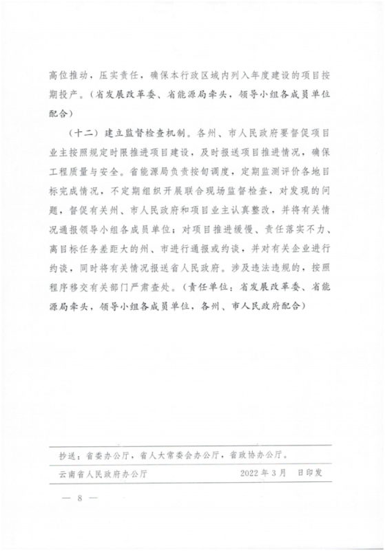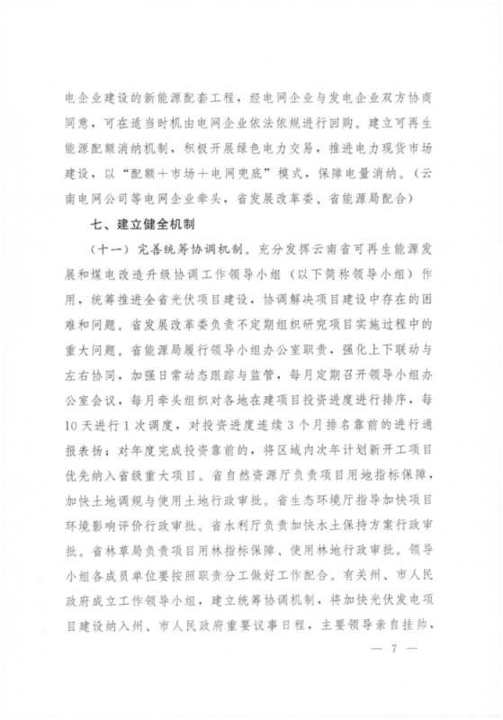 (十一)完善統(tǒng)籌協(xié)調(diào)機制。充分發(fā)揮云南省可再生能源發(fā)展和煤電改造升級協(xié)調(diào)工作領(lǐng)導(dǎo)小組(以下簡稱領(lǐng)導(dǎo)小組)作用,統(tǒng)籌推進全省光伏項目建設(shè),協(xié)調(diào)解決項目建設(shè)中存在的困難和問題。省發(fā)展改革委負責不定期組織研究項目實施過程中的重大問題。省能源局履行領(lǐng)導(dǎo)小組辦公室職責,強化上下聯(lián)動與左右協(xié)同,加強日常動態(tài)跟蹤與監(jiān)管,每月定期召開領(lǐng)導(dǎo)小組辦公室會議,每月牽頭組織對各地在建項目投資進度進行排序,每10天進行1次調(diào)度,對投資進度連續(xù)3個月排名靠前的進行通報表揚;對年度完成投資靠前的,將區(qū)域內(nèi)次年計劃新開工項目優(yōu)先納入省級重大項目。省自然資源廳負責項目用地指標保障,加快土地調(diào)規(guī)與使用土地行政審批。省生態(tài)環(huán)境廳指導(dǎo)加快項目環(huán)境影響評價行政審批。省水利廳負責加快水土保持方案行政審批。省林草局負責項目用林指標保障、使用林地行政審批。領(lǐng)導(dǎo)小組各成員單位要按照職責分工做好工作配合。有關(guān)州、市人民政府成立工作領(lǐng)導(dǎo)小組,建立統(tǒng)籌協(xié)調(diào)機制,將加快光伏發(fā)電項目建設(shè)納入州、市人民政府重要議事日程,主要領(lǐng)導(dǎo)親自掛帥,高位推動,壓實責任,確保本行政區(qū)域內(nèi)列入年度建設(shè)的項目按期投產(chǎn)。(省發(fā)展改革委、省能源局牽頭;領(lǐng)導(dǎo)小組各成員單位配合)