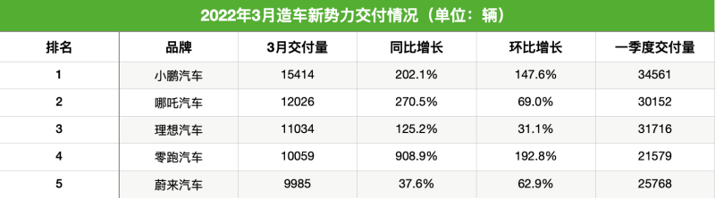 中國儲能網(wǎng)訊:盡管受到動力電池原材料價格上漲等因素的影響,造車新勢力在3月仍繼續(xù)高歌猛進(jìn),多家企業(yè)月交付量再創(chuàng)新高。