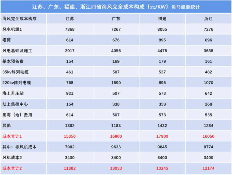 分地區(qū)計算的話,江蘇、廣東、福建、浙江海上風(fēng)電千瓦投資均價在1.54萬元、1.60萬元、1.79萬元、1.61萬元,除廣東(43%)外,其他各省的風(fēng)機(jī)成本占比均為45%。在假設(shè)風(fēng)機(jī)價格降至3400元/kW目非機(jī)組成本不變的情況下,四省海風(fēng)完全成本可以降低至1.14萬元/KW、1.30萬元/KW 、1.32萬元/KW、 1.21萬元/kW。