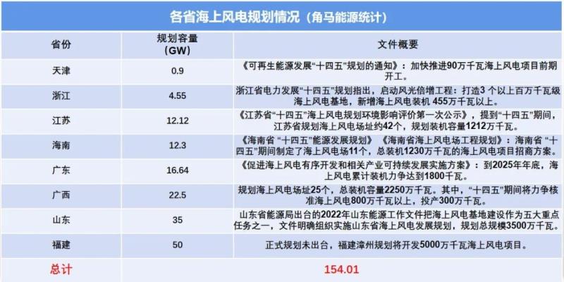 根據(jù)「角馬能源」不完全統(tǒng)計,“十四五”期間,福建、廣東、江蘇、浙江、廣西、天津等8個省份的海上風(fēng)電累計規(guī)劃容量達(dá)到154.01GW。為我國“十三五”海上風(fēng)電增量8.25GW的18.67倍。這意味著,“十四五”末期,海上風(fēng)電將可能迎來倍速增長。
