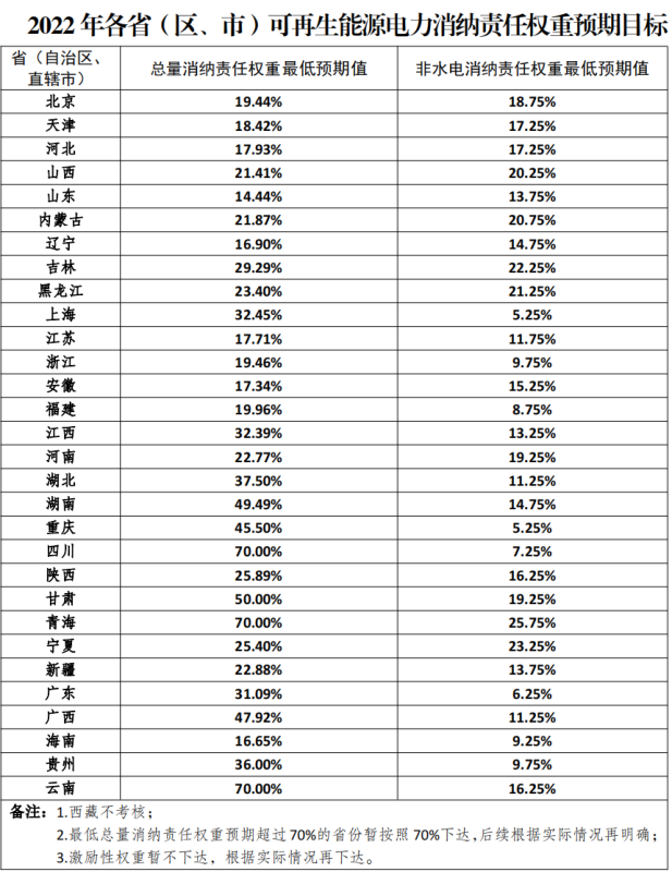 為落實碳達(dá)峰、碳中和任務(wù),實現(xiàn)2025年非化石能源占一次能源消費(fèi)比重提高至20%左右的目標(biāo),去年5月,國家發(fā)展改革委、國家能源局印發(fā)2021年可再生能源電力消納責(zé)任權(quán)重和2022年預(yù)期目標(biāo)。這是各省都將要完成的約束性指標(biāo)。
