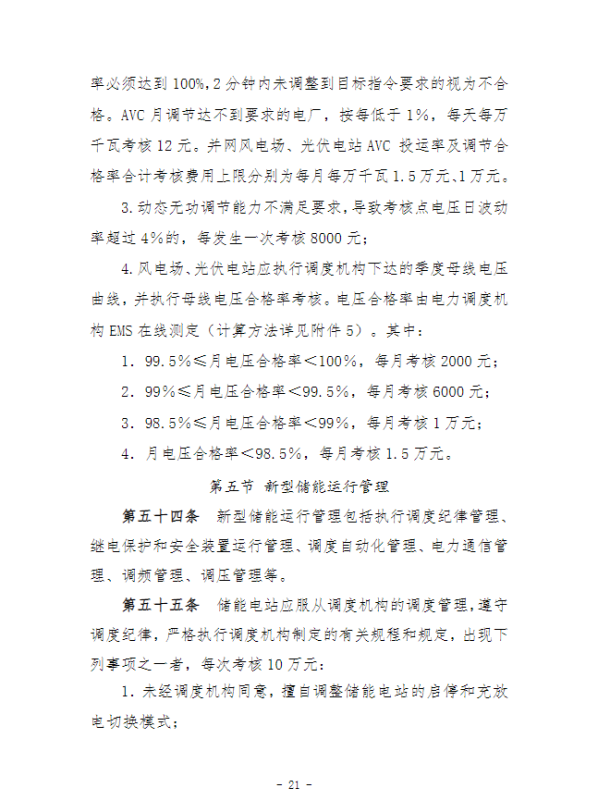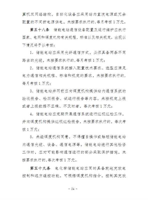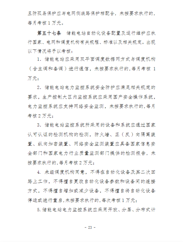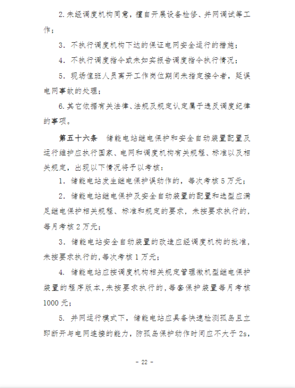 在并網(wǎng)運(yùn)行管理細(xì)則中,“新型儲能運(yùn)行管理”、“抽水蓄能電站可用率管理”章節(jié),明確要求儲能電站應(yīng)服從調(diào)度機(jī)構(gòu)的調(diào)度管理,出現(xiàn)各類違規(guī)情況將需要支付考核費(fèi)用:如出現(xiàn)擅自調(diào)整儲能電站的啟停和充放電切換模式、擅自開展設(shè)備檢修并網(wǎng)調(diào)試工作、或值班人員離守延誤電網(wǎng)事故處理等情況,每次考核10萬元;儲能電站發(fā)生繼電保護(hù)誤動作的,每次考核5萬元;儲能電站繼電保護(hù)及安全自動裝置的配置和選型未按要求執(zhí)行的,每月考核2萬元。