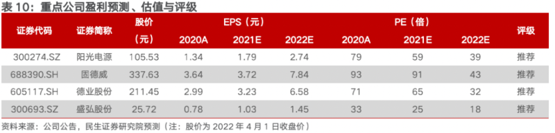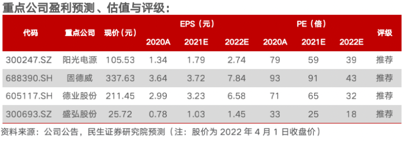 重點推薦含儲量高的逆變器公司【陽光電源】、【德業(yè)股份】、【固德威】、【盛弘股份】;關注儲能消防領域龍頭【青鳥消防】,以及儲能溫控有望快速放量【英維克】。