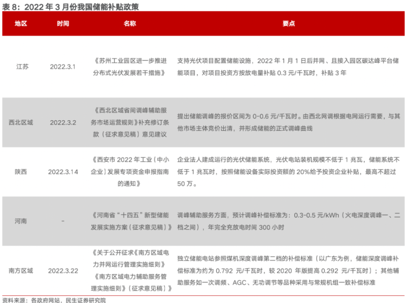 國內強制性配儲地方政策相繼發(fā)布+儲能補貼提高,內蒙古、河南、河北、遼寧四省近日相繼發(fā)布強制性配儲的政策,大多要求配儲時常4小時以上,其中內蒙古、河南要求配儲比例不低于15%,遼寧要求配儲比例10%;另有國內多個區(qū)域發(fā)布儲能補貼政策,加速儲能發(fā)展;以廣東為例,儲能深度調峰補償標準為約為 0.792 元/kWh,較 2020 年版提高 0.292 元/kWh;經測算,提升標準后10年期IRR可達6%以上,電網側獨立儲能調峰具備較好經濟性。