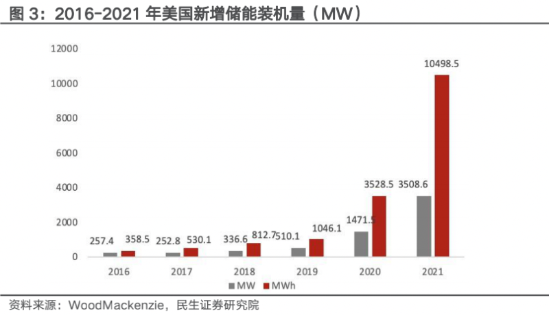 美國市場2022年Q1電網側裝機達到1.7GW。根據WoodMackenzie數據,美國儲能市場2021四季度創(chuàng)下新紀錄,新增裝機規(guī)模達4.7GWh,電網側去年新增裝機規(guī)模達到了3GW/9.2GWh,增長近2倍,此前由于供應鏈問題帶來的700MW產能預計將推遲到2022年一季度開工,推動2022年一季度電網側裝機達到1.7GW,得益于加州以外市場太陽能+儲能的銷售,用電側,戶用端年總裝機量為436MW,2022年一季度裝機達到123MW;工商業(yè)去年四季度裝機規(guī)模為58MWH,全年裝機規(guī)模為162MW/350MWH。