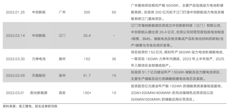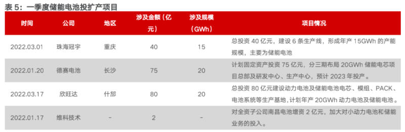 儲能電池方面,據不完全統(tǒng)計,2022年一季度,國內投擴產項目10個,涉及金額超720億元,規(guī)模超166GWh。具體來看,參與主體上,既有包括珠海冠宇、德賽電池等3C數碼電池企業(yè),又有中創(chuàng)新航、力神電池、欣旺達、天能股份等動力電池企業(yè),還有陽光系能源等儲能系統(tǒng)集成商。多元的背景構成了該賽道的公司格局,入局者呈多元化趨勢。投建規(guī)模上,均呈大規(guī)模布局之勢。一季度以來,投擴產項目所涉規(guī)模最小也有10GWh。另外,與去年“動力電池+儲能電池”布局模式不同,儲能單獨投擴產項目日益增多。