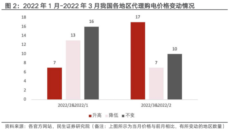 代理購電價格普遍上漲,3月份上漲的省市較2月份增加10個。開年后電網企業(yè)代理購電價格普遍出現上漲,如北京、廣東、上海等等均出現了不同程度的上漲,3月份電價上漲的地區(qū)比2月份多10個,這反映了全國各省市電力供應出現偏緊的態(tài)勢,2022年1月份相較于2021年12月份一般工商業(yè)代理購電峰谷價上漲的地區(qū)為11個超過下降的地區(qū)8個,體現了工商業(yè)峰谷電價差任然是以擴大為主。