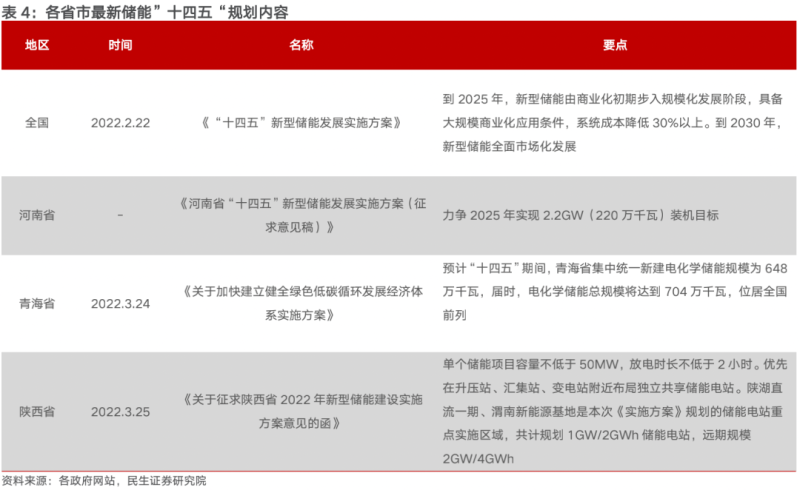 兩部委印發(fā)《“十四五”新型儲能發(fā)展實施方案》,對“十四五”期間儲能發(fā)展進行了頂層設計。方案要求到2025年,新型儲能由商業(yè)化初期步入規(guī)模化發(fā)展階段,具備大規(guī)模商業(yè)化應用條件,系統(tǒng)成本降低30%以上,到2030年,新型儲能全面市場化發(fā)展。“十四五”時期是我國實現碳達峰目標的關鍵期和窗口期,也是新型儲能發(fā)展的重要戰(zhàn)略機遇期。隨著電力系統(tǒng)對調節(jié)能力需求提升、新能源開發(fā)消納規(guī)模不斷加大,尤其是沙漠戈壁荒漠大型風電光伏基地項目集中建設的背景下,新型儲能建設周期短、選址簡單靈活、調節(jié)能力強,與新能源開發(fā)消納的匹配性更好,優(yōu)勢逐漸凸顯,加快推進先進儲能技術規(guī)?;瘧脛菰诒匦小8魇∈幸布娂姲l(fā)布了本省的“十四五”期間儲能發(fā)展政策,其中河南省力爭2025年實現2.2GW裝機目標,陜西省遠期規(guī)劃2GW/4GWh儲能電站,而青海省預計“十四五”期間電化學儲能總規(guī)模將達到70.4GW,位居全國前列。
