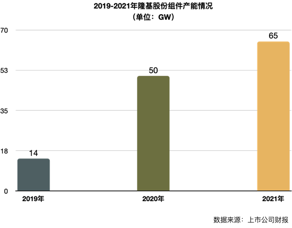 2019年,隆基單晶組件產(chǎn)能達(dá)到14吉瓦。根據(jù)2020年報(bào)公布數(shù)據(jù),其單晶組件銷量達(dá)到24.53吉瓦,組件產(chǎn)能更是達(dá)到50吉瓦,并計(jì)劃至2021年底達(dá)到65吉瓦。