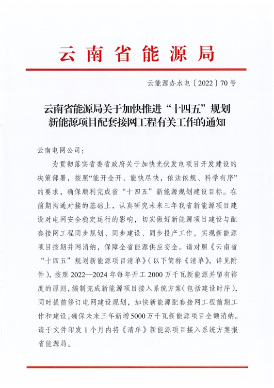 對(duì)照《云南省“十四五”規(guī)劃新能源項(xiàng)目清單》,按照2022-2024年每年開工2000萬千瓦新能源并留有裕度的原則,編制完成新能源項(xiàng)目接入系統(tǒng)方案(包括建設(shè)時(shí)序),同時(shí)提前修訂電網(wǎng)建設(shè)規(guī)劃,加快新能源配套接網(wǎng)工程前期工作和建設(shè),確保未來三年新增5000萬千瓦新能源項(xiàng)目全額消納。并要求文件印發(fā)1個(gè)月內(nèi)將《清單》新能源項(xiàng)目接入系統(tǒng)方案報(bào)省能源局。