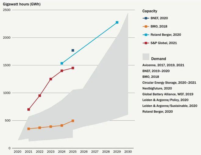 圖1:全球鋰離子電動汽車電池需求預測(圖源:Argonne National Laboratory)