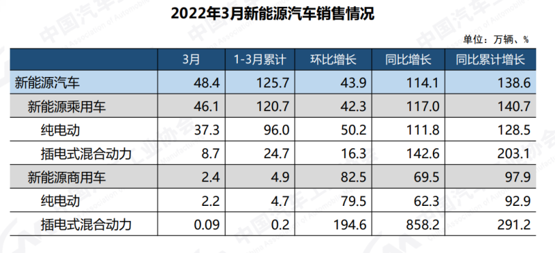 單看3月,新能源汽車產(chǎn)銷分別完成46.5萬輛和48.4萬輛,同比均增長1.1倍。其中純電動汽車產(chǎn)銷分別完成37.6萬輛和39.6萬輛,同比均增長1.1倍;插電式混合動力汽車產(chǎn)銷分別完成8.9萬輛和8.8萬輛,同比分別增長1.6倍和1.4倍;燃料電池汽車產(chǎn)銷分別完成500輛和367輛,同比分別增長10.1倍和5.2倍。