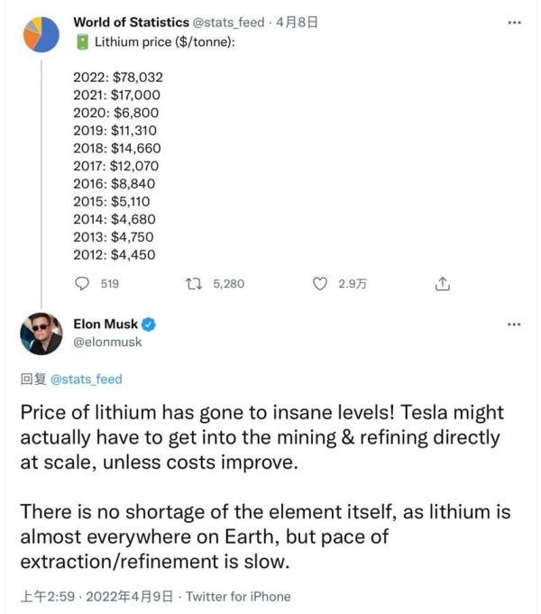 中國儲能網(wǎng)訊:日前,特斯拉首席執(zhí)行官馬斯克轉(zhuǎn)發(fā)了一條鋰價(jià)十年漲幅的推文,并評論稱“鋰價(jià)已經(jīng)漲到瘋狂的水平,特斯拉或許不得不直接展開大規(guī)模的開采和精煉業(yè)務(wù),除非成本壓力有所緩解?!边@不是特斯拉第一次萌生進(jìn)軍鋰業(yè)的想法。